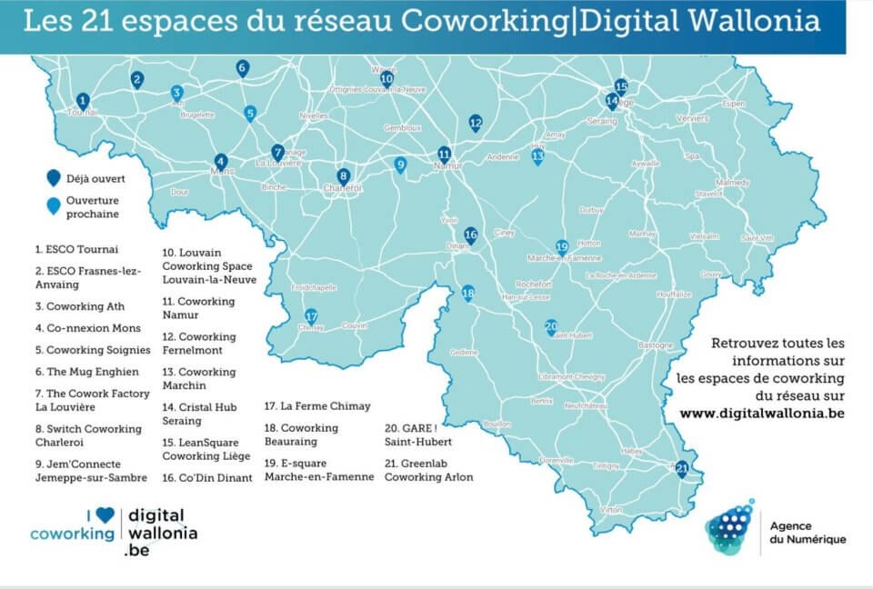Coworking|Digital Wallonia est le réseau des espaces de coworking wallons développé depuis 2011 par le Gouvernement wallon. Il est constitué de 21 espaces de coworking et est coordonné par l’Agence du Numérique. Son développement est soutenu par la stratégie numérique pour la Wallonie, Digital Wallonia.
